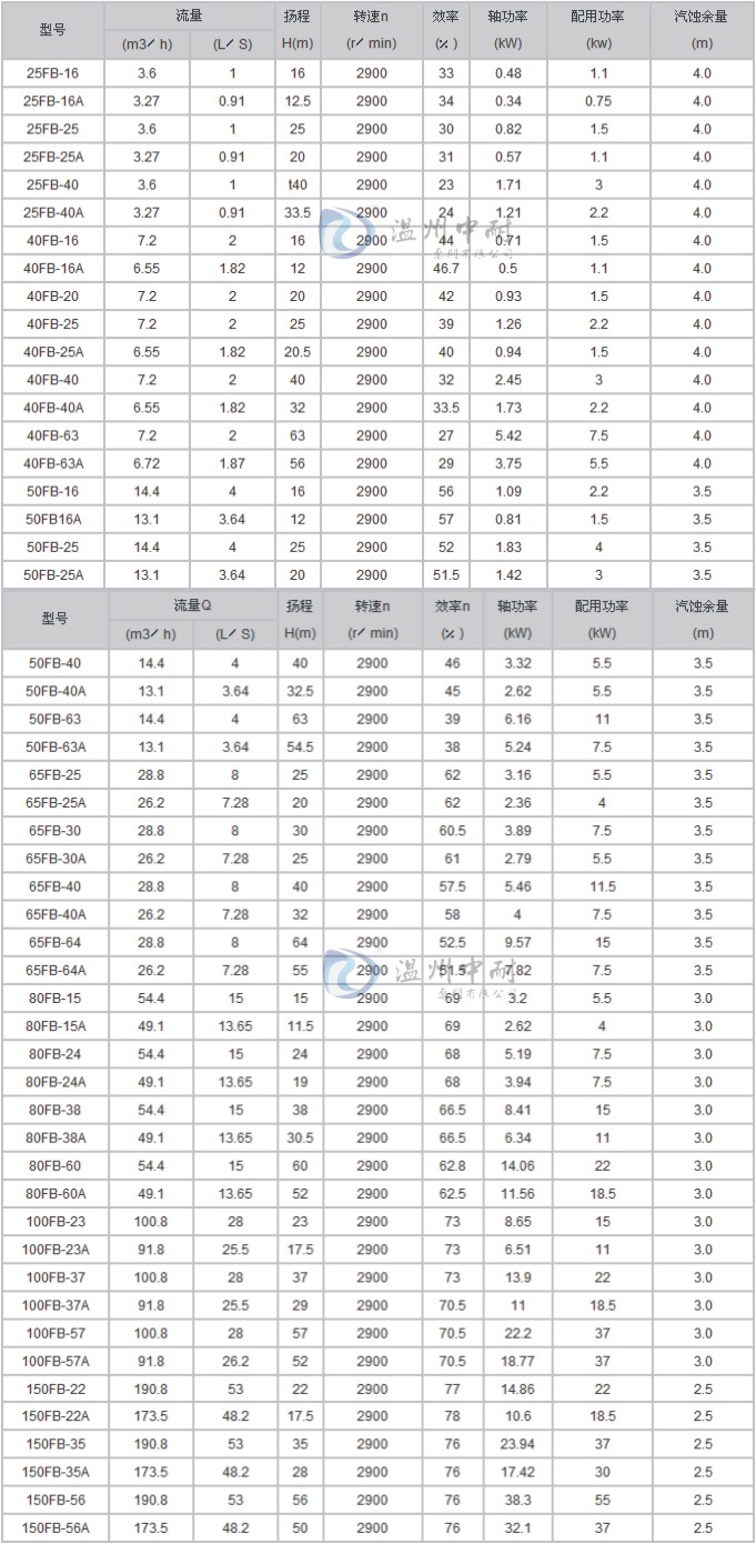 ■ FB、AFB型不锈钢离心泵┃耐腐蚀离心泵性能参数: