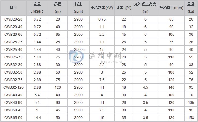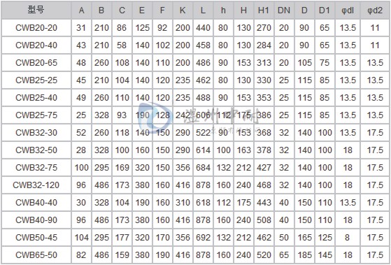 ■ CWB型不锈钢磁力驱动漩涡泵性能参数: