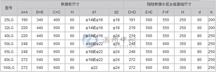 3、LG、LG-B型立式多级泵与底座安装有两种方式,一种直接装在水泥基础上的刚性连接,另一种是采用JGD型减振器安装的柔性连接,具体方法见安装示意图所示。