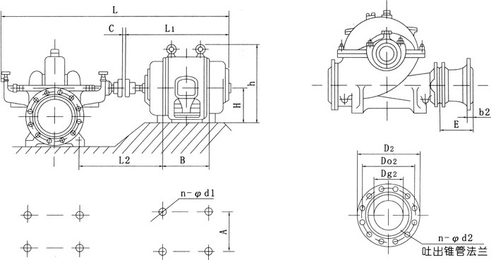 S、SH型单级双吸中开式离心泵泵体与泵盖构成叶轮的工作室,在进出水法兰上制有安装真空表和压力表的管螺孔,进出水法兰的下部制有放水的管螺孔。