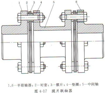 膜片联轴器采用一组厚度很薄的金属弹簧片,制成各种形状,用螺栓分别与主从动轴上的两半联轴器联接,见图4-17.其结构简单,不需要润滑和维护,耐高温变形,对中性能好,可靠性高,传动扭矩大,但价格较高。