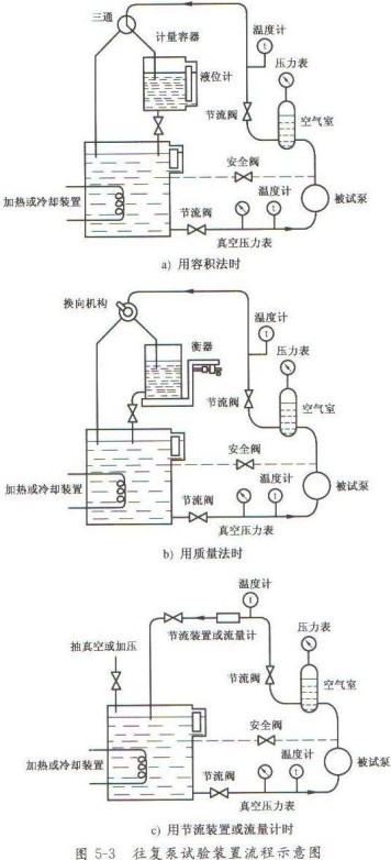 往复泵的试验装置和离心泵的系统基本相同,只是由于往复泵的排出压力一般较高,从安全考虑应该配置安全阀等防止超压的装置.对往复泵的试验装置的一般要求主要有: