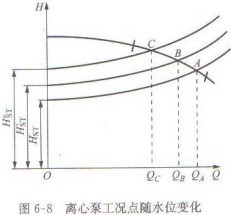 既然离心泵装置的工况点是建立于水泵和管道系统能量供求关系的平衡上,那么,只要两者之一情况发生改变时,其工况点就会发生转移。这种暂时的平衡点就会被另一种新的平衡点所代替。这样的情况,在城市供水中是随时都在发生着的。例如,有对置水塔的城市管网,在晚上,城市中用水量减少,水输入水塔,水塔的水箱中水位不断升高(见图6-8),水泵的工况点将沿Q-H曲线向流量减小侧移动(向左移动,有A点移至C点)供水量减少。相反的,在白天,城市中用水量增大,管网内静压下降,水压出水,水箱中水位下降,水泵装置的工况点就将自动向流量增大侧移动(向右移动)。因此,泵站在整个工作中,只要城市管网中用水量是变化的,管网压力就会有变化,致使水泵装置的工况点也作相应的变动,并按上述能量供求的关系,自动地建立新的平衡。所以,水泵装置的工况点,实际上是在一个相当幅度的区间内游动着的。离心泵具有这种自动调节工况点的性能,也大大地增加了它在给水排水过程中的使用价值。当管网中压力的变化幅度太大时,水泵站的工况点将会移出其“高效段”以外,在低效率点处工作。针对这种情况,在泵站的运行管理中,长需要人为地对水泵装置的工况点进行必要的改变和控制,我们把这种改变和控制称为“调节”。这种调节可以是自动的并且可以优化,达到佳的节能效果。在工业设备冷却水总管上的压力,也就是图中的静扬程,这个静扬程有可能因工艺流程工况的变化而变化。