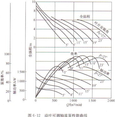 图6-12为动叶可调轴流泵的性能曲线,它反映了动叶安装角βb改变时,泵流量、扬程、功率和效率的变化情况。