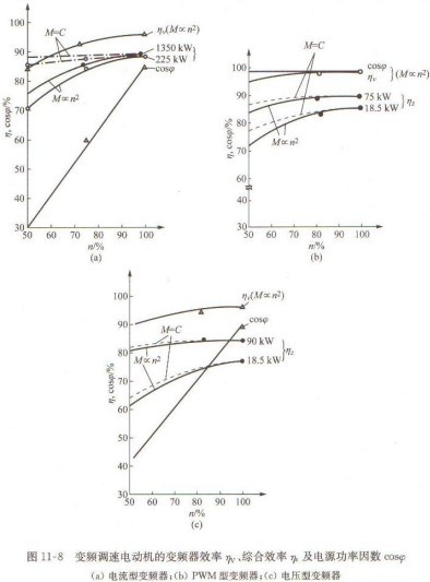 图11-8为典型的电流型、PWM型及电压型变频调速电动机的变频器效率ηv、综合效率ηz及电源功率因数