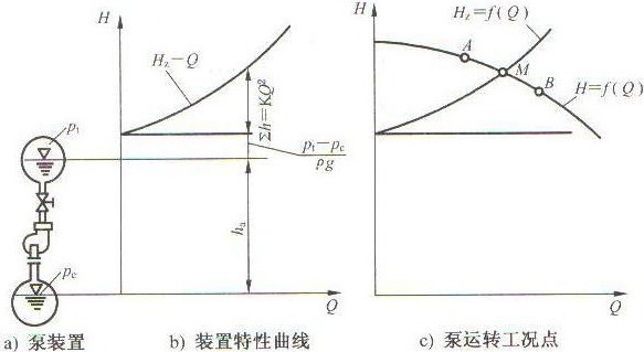 在该点单位重量液体通过泵增加能量(泵扬程H)正好等于单位重量液体从吸水池液面送到排水池液面所需要的能量(即装置扬程Hz),故M点是泵稳定的运行点。如果泵偏离M点在A点工作,这时H>Hz,多余的能量促使流速增加,泵的流量增加,工况点从A点移向M点;反之,如泵在B点工作,这时H<Hz,泵内流速将降低,流量减小,工况点将从B点移向M点,终回到M点稳定下来。因而泵的稳定工况点一定是泵特性曲线和装置特性曲线的交点。