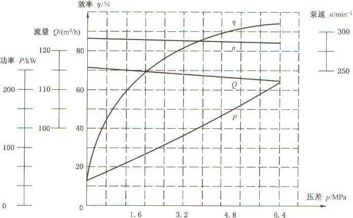往复泵的特性曲线常用横坐标表示压差p,纵坐标表示流量Q、效率η、泵速n、轴功率P等,图2是往复泵的特性曲线值示例。