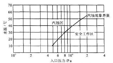 在汽蚀现象界线曲线上方是汽蚀区, 曲线下方是平安工作区。用户只需依据工作水温, 查找汽蚀现象界线曲线, 只需工作在曲线下方的压力范围内, 就不会发作汽蚀。