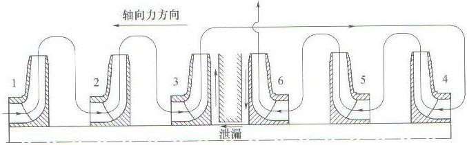 对称布置叶轮因为有级间泄漏,轴向力并没有完全平衡;要想完全平衡就得使此泄漏为零,这一般是很难做到的。如图1所示是MD280-43卧式多级泵原理对称布置示意图,吸入压力1,排出叶轮6,在叶轮3和叶轮6之间设有间隙密封,泄漏从6级叶轮后盖板测流向3级叶轮的后盖板侧,使3级叶轮后盖板侧的压力增高,产生附加的指向吸入端的轴向力,级间密封的效果不好,这种附加的轴向力可能很大。产生这种附加轴向力的第二个原因,级间泄漏使6级叶轮后盖板侧泵腔的液体内向流动,3级后盖板侧泵腔的液体外向流动。内向流动使本来按抛物线分布的压力减小,外向流动使此处的压力增加,同样产生附加的指向吸入端的轴向力。