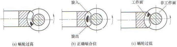 (1)重装或更换新蜗杆、蜗轮时,注意重新调整蜗轮与蜗杆的啮合位置(图1)。调节方法是将蜗轮工作齿面薄薄地涂上一层红丹,用手旋转蜗杆数转,观察起啮合点的位置,通过增减垫片的数量,使啮合点达到正确的位置。