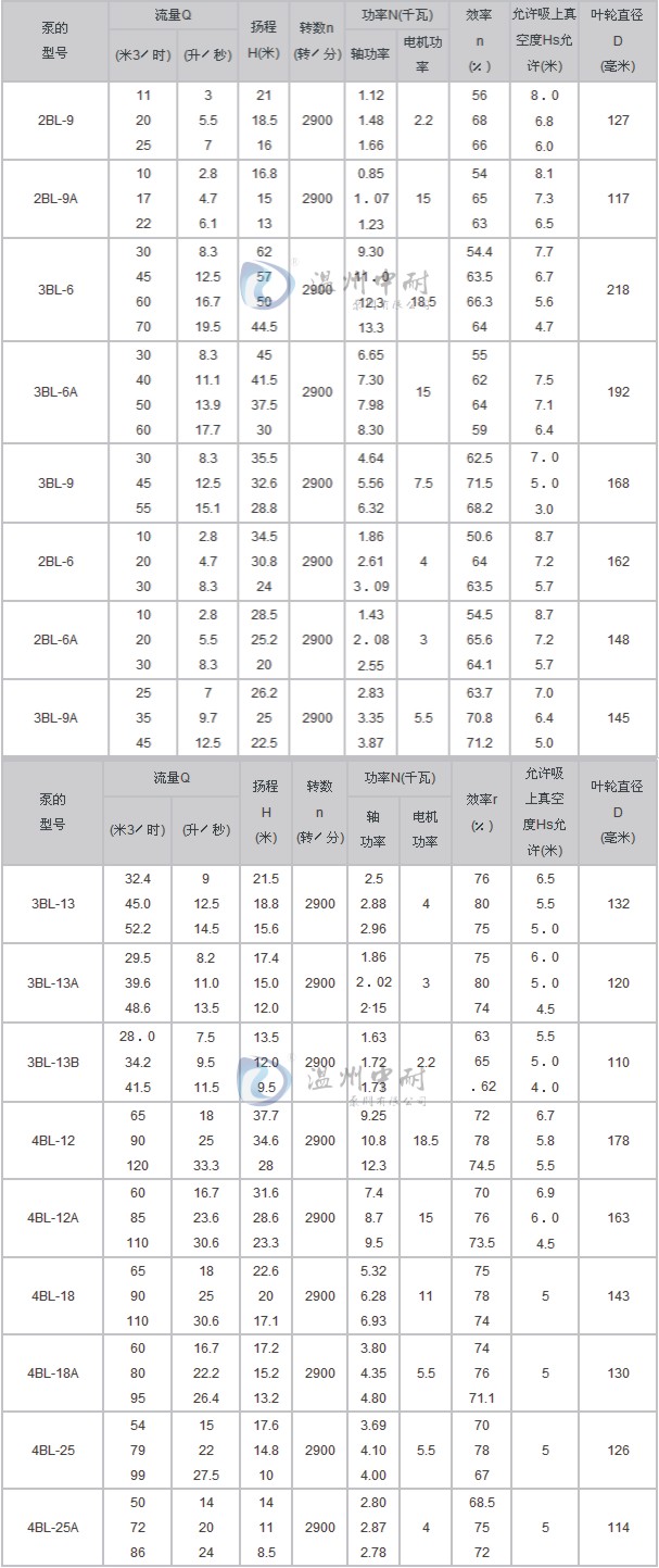 BL型卧式单级离心泵系单级单吸悬臂式直连离心清水泵是根据BA型泵基础上对结构改进,具有外形小、重量轻、结构简单、安装方便等特点,可供输送清水及物理化学性质类似于水的液体之用。本型泵扬程在8.8—62米时,流量为4.5—120米3/时,液体的高温度不得超过60℃,适合于工厂、矿山、城市给水和农用灌溉等用。目前本厂制造的BL型泵有:11/2BL-6、2BL-6、2BL-9、3BL-6、3BL-9、3BL-13、4BL-12、4BL-18、4BL-25共9种,规格型号20个。