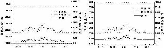 图6 冬季供暖期深井泵日供水量情况 图7 冬季供暖期深井泵日耗电量情况