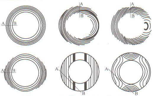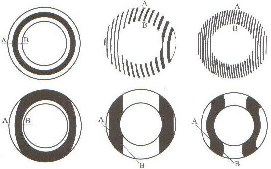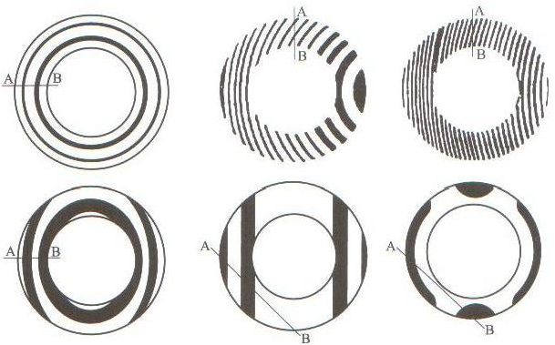 (1)平面度测定值的判读按图2~图5的规定。每组图由左向右第2、3个为待侧平面与平晶成楔形位干涉图,其余4个为待测平面与平晶平行接触位干涉图。光带条数为线段AB穿过暗带的条数。对于未包含的图形,判读者应在正确理解光干涉原理的基础上,参照图例进行判读。