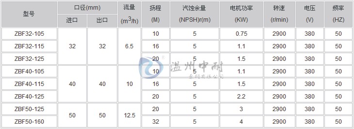 ■ ZBF型耐腐蚀塑料自吸磁力泵性能参数: