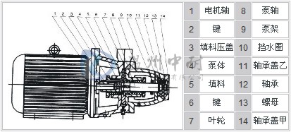 泵体4与电机法兰连接,泵轴8装在电机轴头上是动配合,键2在键槽内可自由滑动。