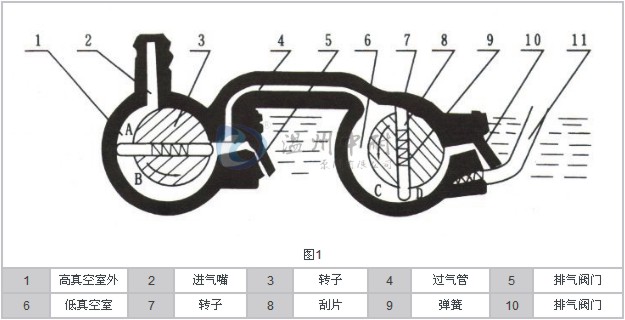 在泵体内压入一个中隔板、将泵壳分成高低真空室,各室都有排气门,高真空室排气与低真空室进气相通。高转子前端伸出前轴;后端伸出后轴。前轴通过前端板的轴承支持、经过油密封室而伸出前端板外:后轴由中隔板上的轴承支持。而伸入低真空室内,低真空室转子则装在后轴上、故高低转子均由前轴带动。高低转子都有对开的槽子,呈“T”形的旋片由弹簧开而装于槽内。泵的进气口处有过滤网,而排气口处有挡油网,视镜左边有掺气阀,下边有放油塞。