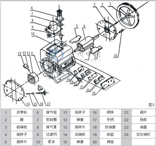 2、装配前应清洗干净并烘干,按图4进行装配,先装高真空端,将弹簧转片托起装入高转子内,然后放进高真空室,装上前端板,再装定位销钉,均匀拧紧螺钉,装配后应保证转动灵活轻松 ,均匀一致。然后再装低真空转子及后端盖,低转片的槽应向后端板一边。再装排气门,排气阀片应贴紧阀板坐,再装其它零件。