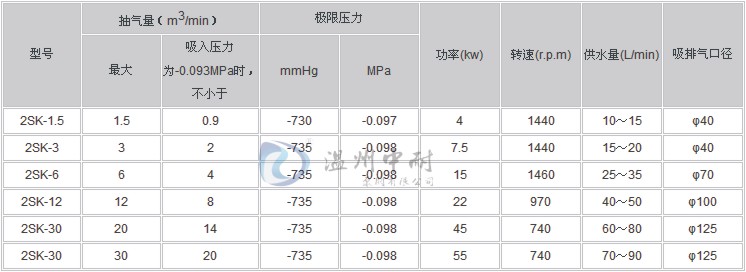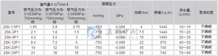 2SK型适用于吸入压力低于-0.08MPa的工况条件。2SK-P1系列适用于吸入压力低于-0.096MPa的工况条件,在配用大气泵时,极限真空度可达-750mmHg。